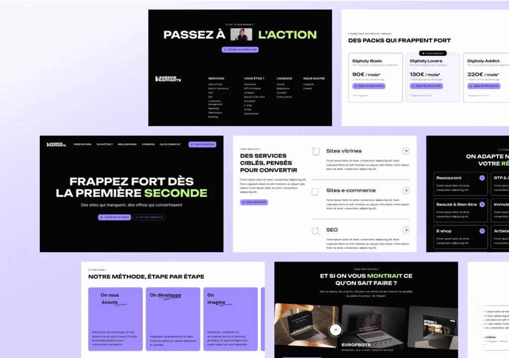 L’ensemble des écrans a été pensé pour intégrer différents points d’entrée vers la prise de contact (devis instantané, appel stratégique, segmentation par profil), tout en conservant une cohérence globale entre ton, contenu et interface.
